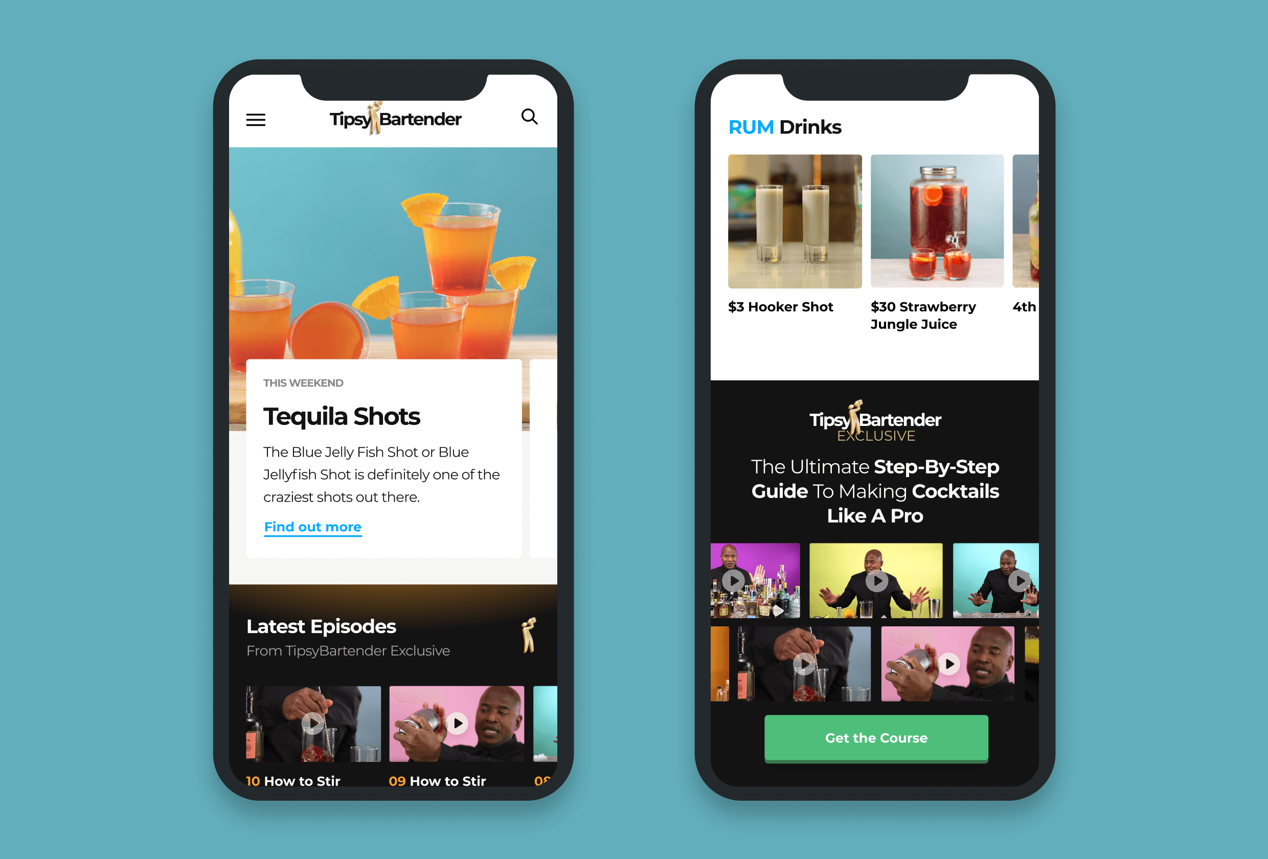 TipsyBartender is a website that helps you learn how to create cocktails and booze-infused treats trough-out thousands of video tutorials, hosted by Skyy John. We help them design a new part fo the website featuring 12 lesson course and improve existing homepage layout.